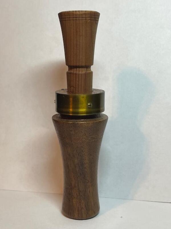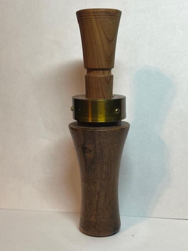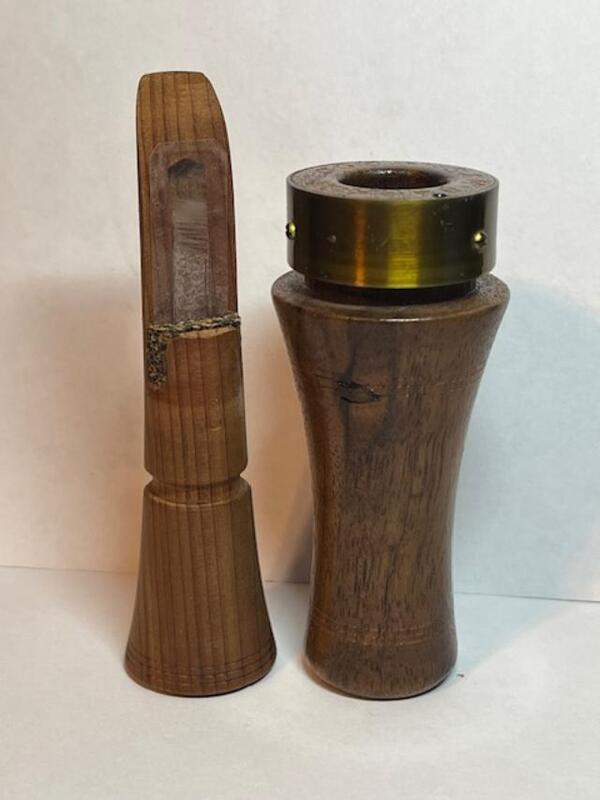 This Duck Call was made by Sam Barker (1946-2017) of East Prairie, MO. Call is 5" and AR Style. Its barrel is Walnut and the stopper is Cedar. Call is banded and signed on the Stopper. I purchased this call from Sam in 2000 on a visit to his home.
