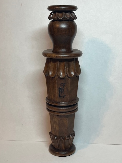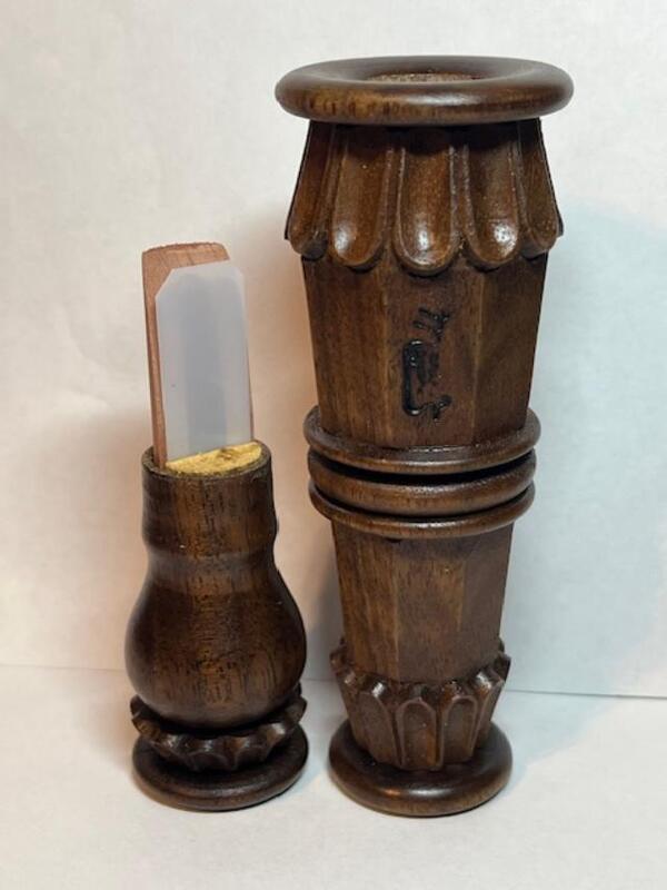 This Fine Carved Duck Call was made by Marv Meyer of Tomah, WI. formally of Richfield, MN. Call is 5 7/8" tall and LA. Style. Call is Walnut and has a Craved "Captive Ring" that spins around the middle of the Barrel. Call has Marv's brand on the barrel. Call in NEW.