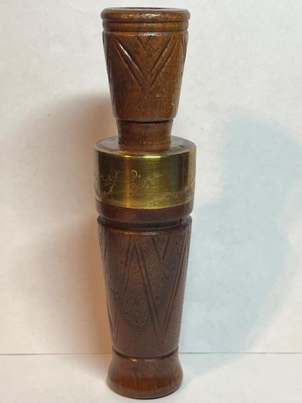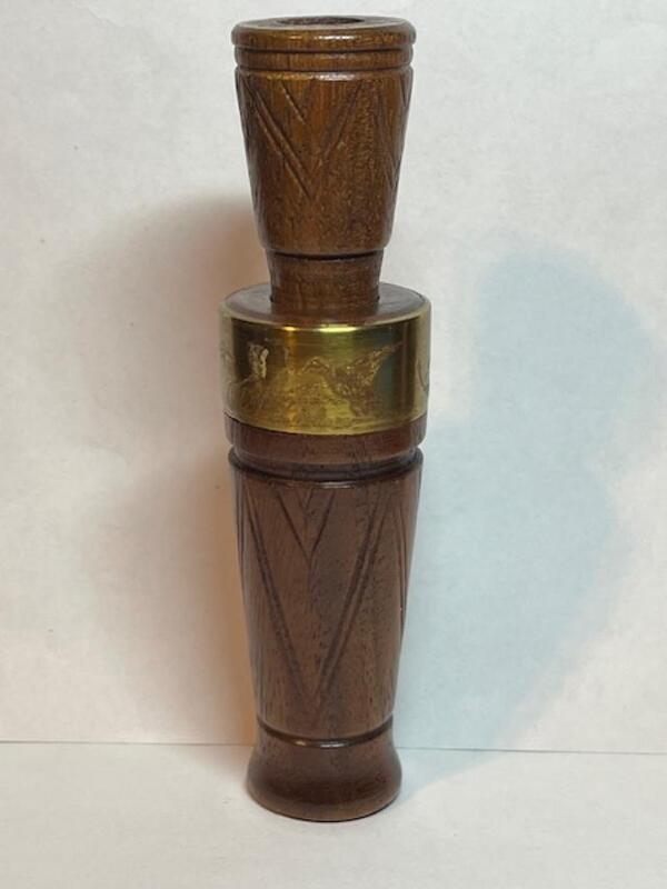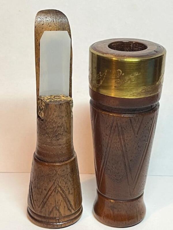 This is a Walnut Duck Call made by Dick Burge of Fort Worth, TX. Call is 4 5/8" and AR. Style. The call has carved panels on the barrel & stopper. The band is engraved with flying and swimming ducks on water. It also is signed, "D. Burge". Call is in NEW Condition.