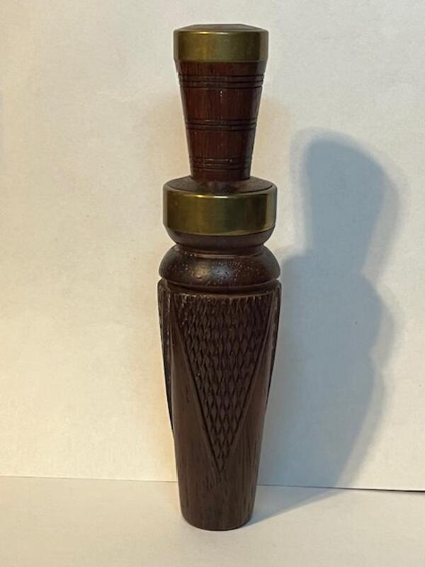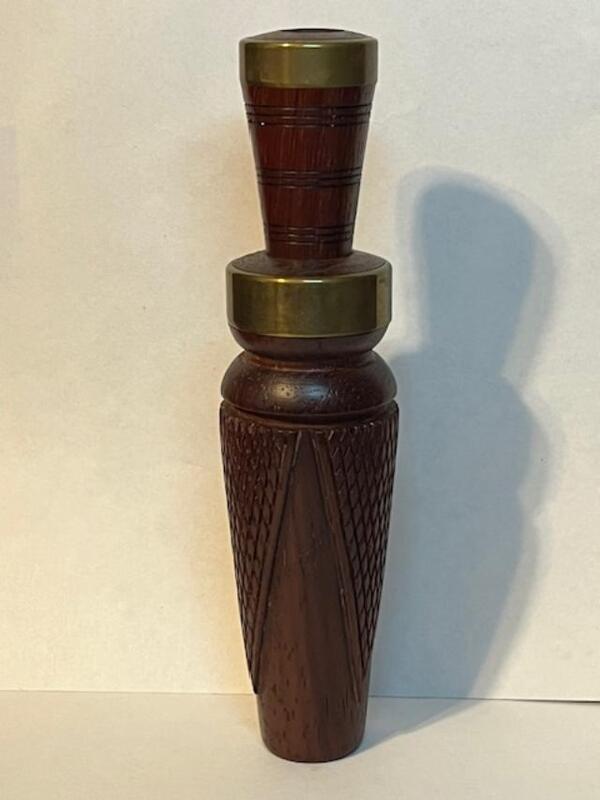This Fine Duck Call was made by Joe Jaroski (1925-2011) of DuQuoin, IL. Call is 5 1/2" and Banded on both the barrel & stopper. Call is AR Style and has 3 Raised Checkered Panels on the barrel. Call is signed and dated, "1994" on the stopper. I believe the call is made from Purple Heart Wood. It is in EX Condition.