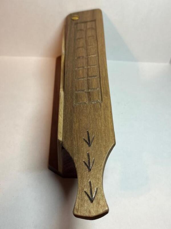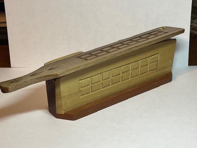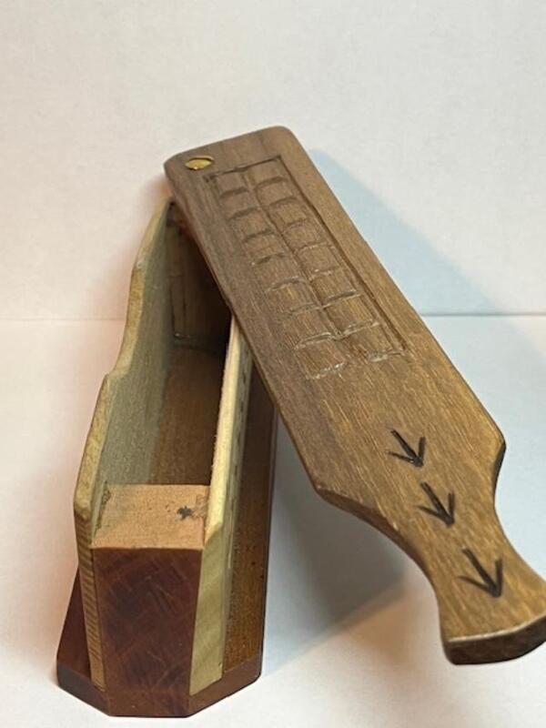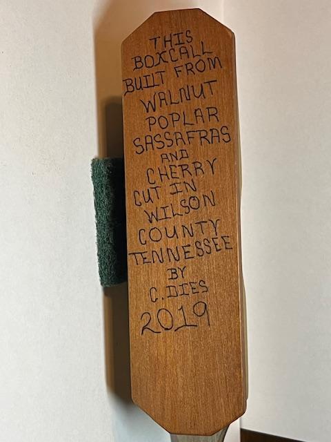 This is a Custom Built Turkey Box Call by Clarence Dies of Lebanon, TN. Call is built from Walnut, Poplar, Sassafras and Cherry. Call is 8" long and Checkered on the top and one side. Call is a One Sided Box Call. Call is signed & Dated. "2019" on the bottom. A Great Sounding Call.